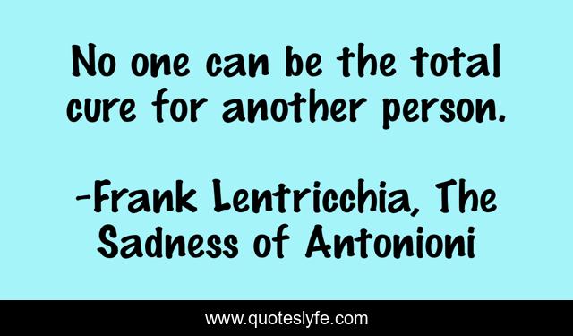 This page presents the quote "No one can be the total cure for another person.". Author of this quote is Frank Lentricchia, The Sadness of Antonioni. This quote is about cure, film, frank-lentricchia, the-sadness-of-antonioni,.