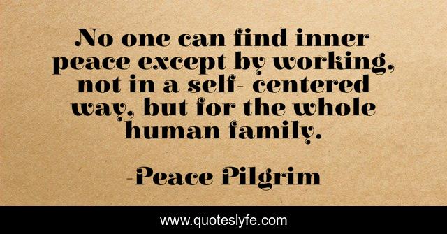 This page presents the quote "No one can find inner peace except by working, not in a self- centered way, but for the whole human family.". Author of this quote is Peace Pilgrim. This quote is about self, peace, working,.