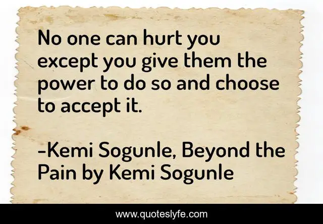 This page presents the quote "No one can hurt you except you give them the power to do so and choose to accept it.". Author of this quote is Kemi Sogunle, Beyond the Pain by Kemi Sogunle. This quote is about life, pain, life-lessons, beyond-the-pain, relationship-value-of-life-truth, healing, truth,.