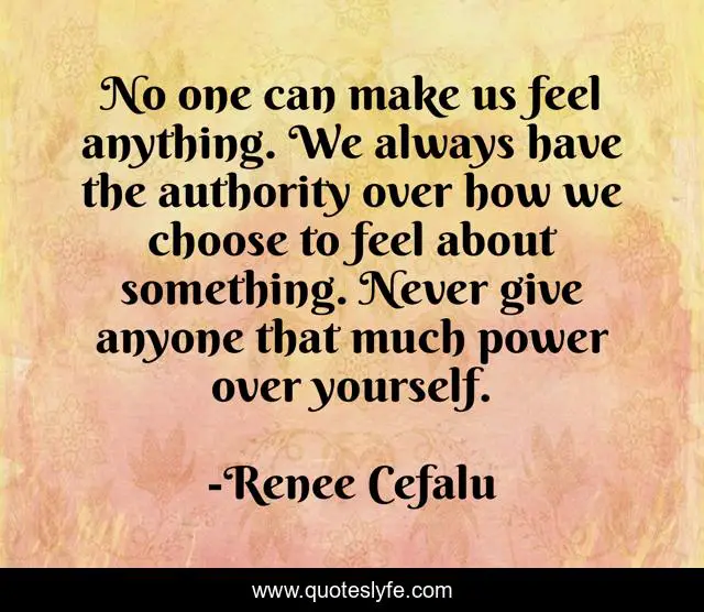 This page presents the quote "No one can make us feel anything. We always have the authority over how we choose to feel about something. Never give anyone that much power over yourself.". Author of this quote is Renee Cefalu. This quote is about emotion, self-mastery,.