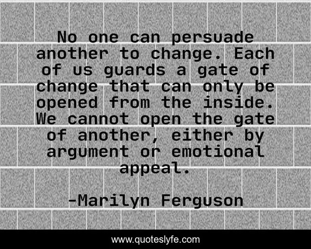 This page presents the quote "No one can persuade another to change. Each of us guards a gate of change that can only be opened from the inside. We cannot open the gate of another, either by argument or emotional appeal.". Author of this quote is Marilyn Ferguson. This quote is about emotional, inside, argument,.