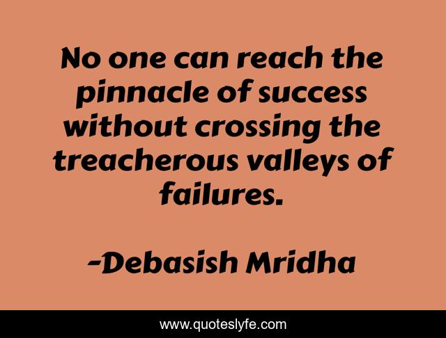 This page presents the quote "No one can reach the pinnacle of success without crossing the treacherous valleys of failures.". Author of this quote is Debasish Mridha. This quote is about life, love, knowledge, inspirational, intelligence, philosophy, wisdom, quotes, affection,.