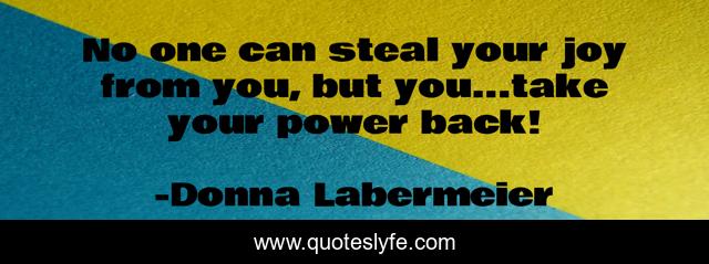 This page presents the quote "No one can steal your joy from you, but you...take your power back!". Author of this quote is Donna Labermeier. .