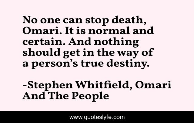This page presents the quote "No one can stop death, Omari. It is normal and certain. And nothing should get in the way of a person’s true destiny.". Author of this quote is Stephen Whitfield, Omari And The People. This quote is about magic, romantic-adventure, realism, fiction,.