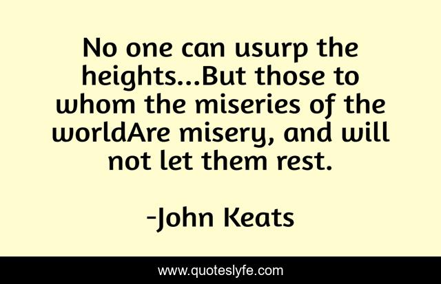 This page presents the quote "No one can usurp the heights...But those to whom the miseries of the worldAre misery, and will not let them rest.". Author of this quote is John Keats. This quote is about sadness, poetry, misery,.