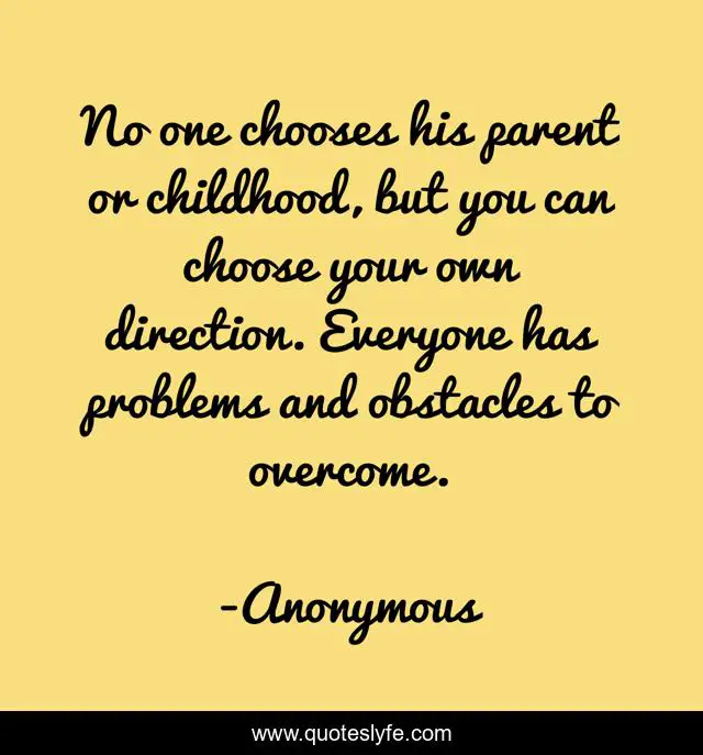 This page presents the quote "No one chooses his parent or childhood, but you can choose your own direction. Everyone has problems and obstacles to overcome.". Author of this quote is Anonymous. This quote is about direction, parent, life, choice, problems-obstacles, childhood, overcome,.