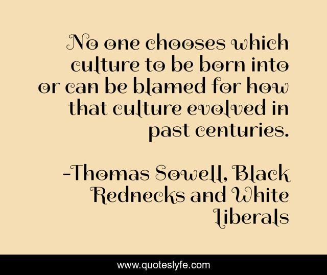 This page presents the quote "No one chooses which culture to be born into or can be blamed for how that culture evolved in past centuries.". Author of this quote is Thomas Sowell, Black Rednecks and White Liberals. This quote is about norms, culture,.