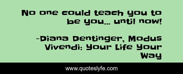 This page presents the quote "No one could teach you to be you... until now!". Author of this quote is Diana Dentinger, Modus Vivendi: Your Life Your Way. This quote is about spiritual-growth, confidence, meaning-of-life, personal-growth, positive, motivational, life-purpose, optimistic, inspirational,.