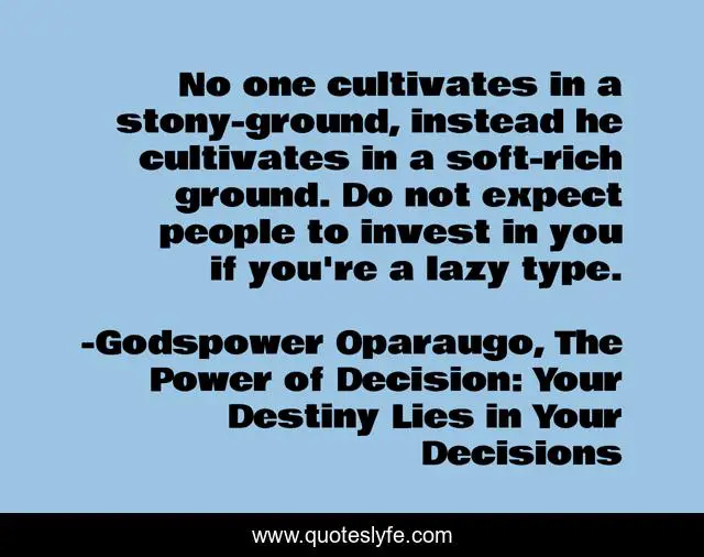 This page presents the quote "No one cultivates in a stony-ground, instead he cultivates in a soft-rich ground. Do not expect people to invest in you if you're a lazy type.". Author of this quote is Godspower Oparaugo, The Power of Decision: Your Destiny Lies in Your Decisions. This quote is about confidence, economics, finance, positive, motivational, management-and-leadership, religion, optimistic, inspirational,.