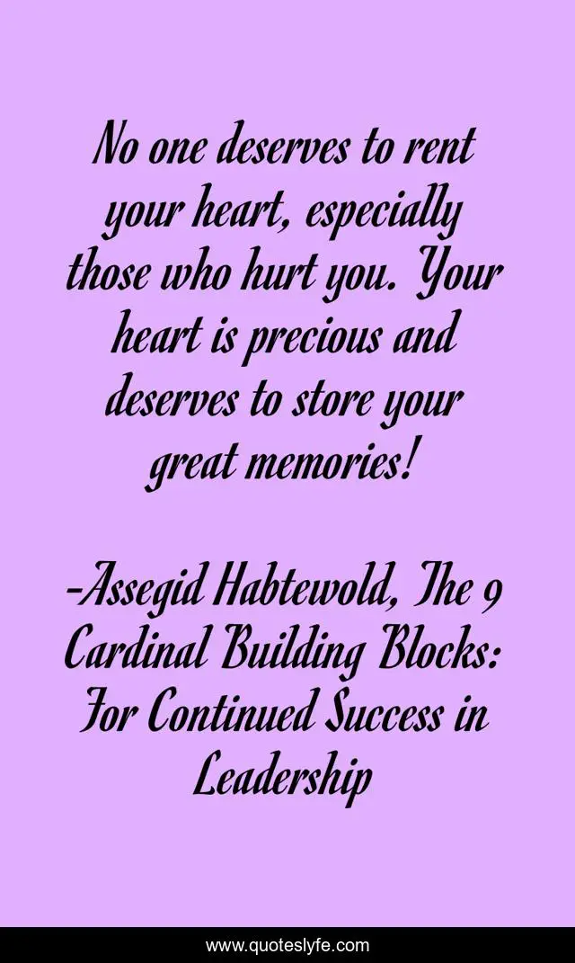 This page presents the quote "No one deserves to rent your heart, especially those who hurt you. Your heart is precious and deserves to store your great memories!". Author of this quote is Assegid Habtewold, The 9 Cardinal Building Blocks: For Continued Success in Leadership. This quote is about memories, hurt, heart,.