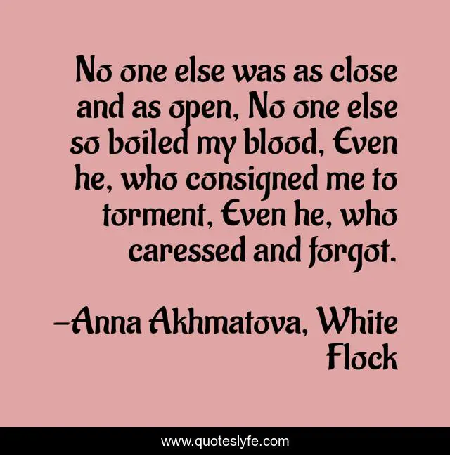 This page presents the quote "No one else was as close and as open, No one else so boiled my blood, Even he, who consigned me to torment, Even he, who caressed and forgot.". Author of this quote is Anna Akhmatova, White Flock. This quote is about loss, love, poetry, affection,.