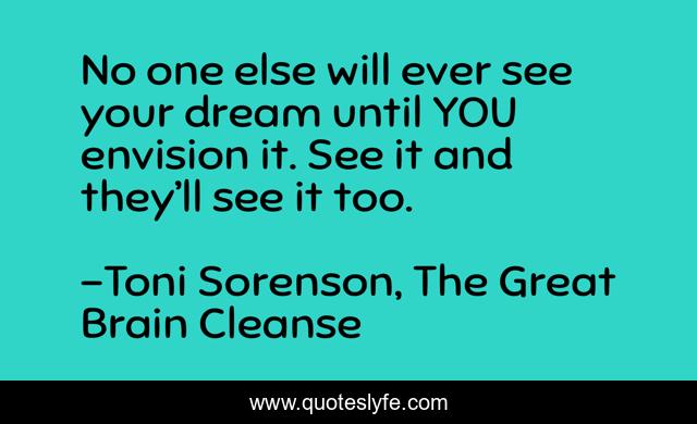 This page presents the quote "No one else will ever see your dream until YOU envision it. See it and they’ll see it too.". Author of this quote is Toni Sorenson, The Great Brain Cleanse. This quote is about life, envision, see, dreamers, goals, fitness, dreams, vision,.
