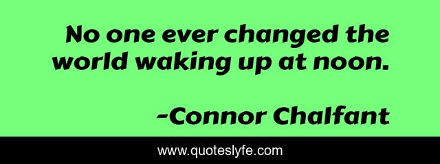 This page presents the quote "No one ever changed the world waking up at noon.". Author of this quote is Connor Chalfant. This quote is about life, changing-your-mindset, changing-the-world, changing-your-life, motivation, waking, waking-up-in-the-morning, changing, waking-up,.