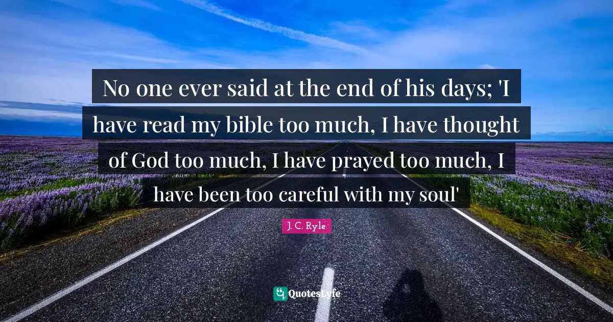 This page presents the quote "No one ever said at the end of his days; 'I have read my bible too much, I have thought of God too much, I have prayed too much, I have been too careful with my soul'". Author of this quote is J. C. Ryle. This quote is about soul, christian, bible, god, careful, said, too much, my soul,.