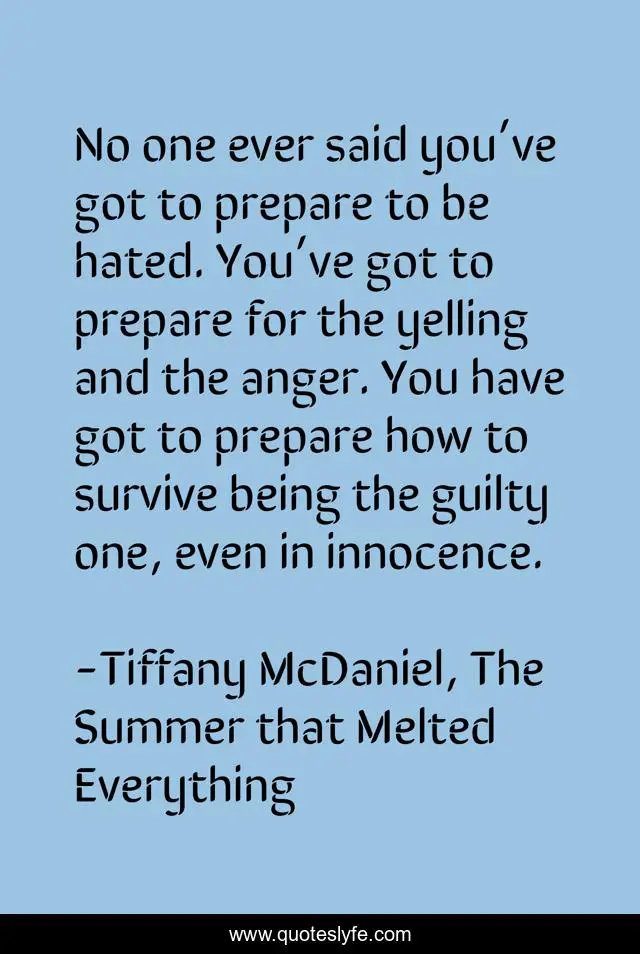 This page presents the quote "No one ever said you’ve got to prepare to be hated. You’ve got to prepare for the yelling and the anger. You have got to prepare how to survive being the guilty one, even in innocence.". Author of this quote is Tiffany McDaniel, The Summer that Melted Everything. This quote is about hate, homophobia, racism,.