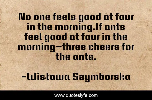 This page presents the quote "No one feels good at four in the morning.If ants feel good at four in the morning—three cheers for the ants.". Author of this quote is Wisława Szymborska. This quote is about busy-ness, anxiety, ants,.