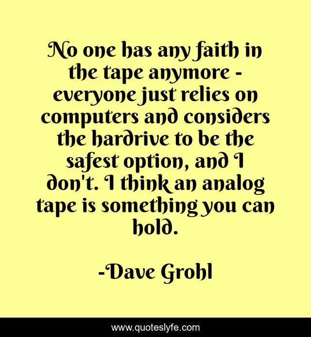 This page presents the quote "No one has any faith in the tape anymore - everyone just relies on computers and considers the hardrive to be the safest option, and I don't. I think an analog tape is something you can hold.". Author of this quote is Dave Grohl. This quote is about faith, think,.