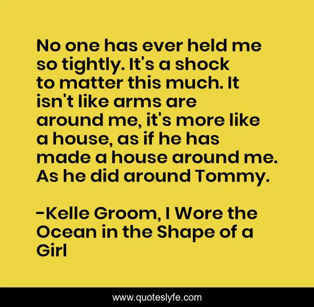 This page presents the quote "No one has ever held me so tightly. It's a shock to matter this much. It isn't like arms are around me, it's more like a house, as if he has made a house around me. As he did around Tommy.". Author of this quote is Kelle Groom, I Wore the Ocean in the Shape of a Girl. This quote is about grief, love, affection,.