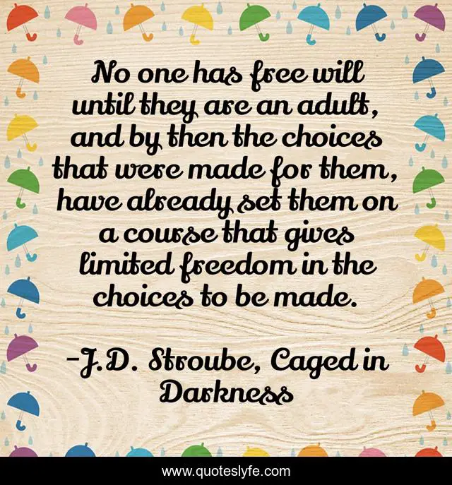 This page presents the quote "No one has free will until they are an adult, and by then the choices that were made for them, have already set them on a course that gives limited freedom in the choices to be made.". Author of this quote is J.D. Stroube, Caged in Darkness. This quote is about knowledge, fate, freedom, free-will, destination, choices, thought, course, path,.