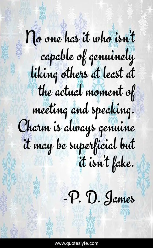 This page presents the quote "No one has it who isn't capable of genuinely liking others at least at the actual moment of meeting and speaking. Charm is always genuine it may be superficial but it isn't fake.". Author of this quote is P. D. James. .