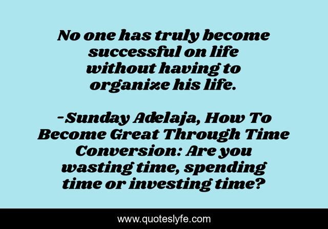 This page presents the quote "No one has truly become successful on life without having to organize his life.". Author of this quote is Sunday Adelaja, How To Become Great Through Time Conversion: Are you wasting time, spending time or investing time?. This quote is about life, conversion, productivity, wealth, greatness, waste, humanity, product, time,.