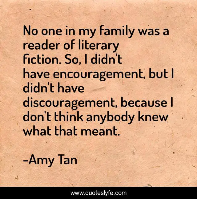 This page presents the quote "No one in my family was a reader of literary fiction. So, I didn't have encouragement, but I didn't have discouragement, because I don't think anybody knew what that meant.". Author of this quote is Amy Tan. This quote is about think, encouragement,.