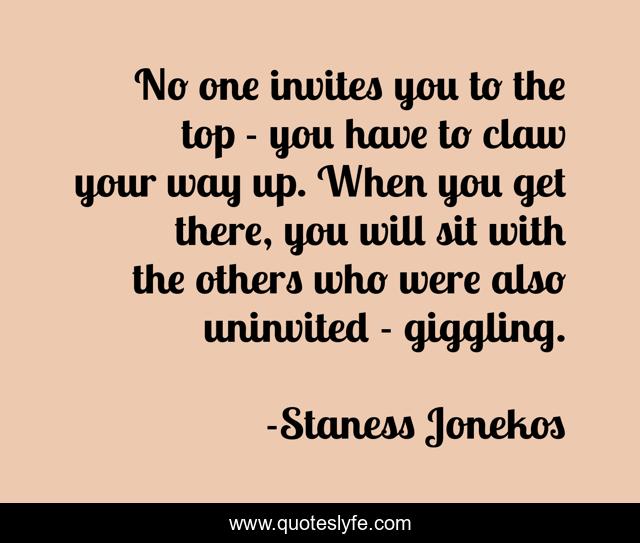 This page presents the quote "No one invites you to the top - you have to claw your way up. When you get there, you will sit with the others who were also uninvited - giggling.". Author of this quote is Staness Jonekos. This quote is about enthusiasm, happiness, inspirational, women,.