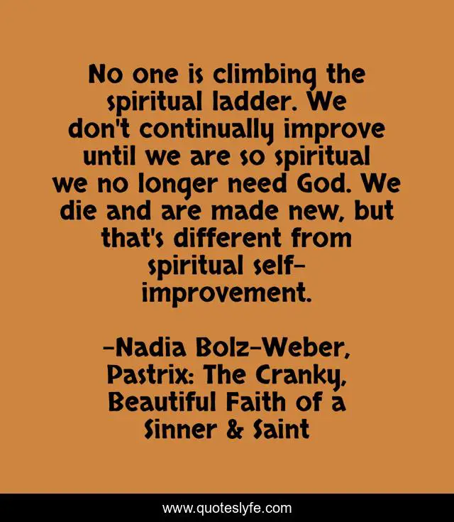 This page presents the quote "No one is climbing the spiritual ladder. We don't continually improve until we are so spiritual we no longer need God. We die and are made new, but that's different from spiritual self-improvement.". Author of this quote is Nadia Bolz-Weber, Pastrix: The Cranky, Beautiful Faith of a Sinner & Saint. This quote is about christian-faith, christianity, spirituality, pastor-ross-merkel, god-s-grace, sermon,.