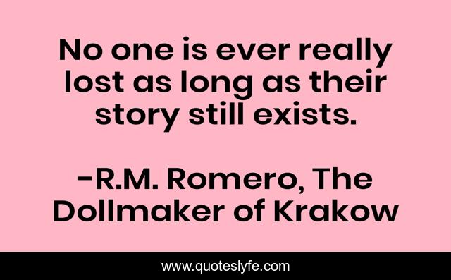This page presents the quote "No one is ever really lost as long as their story still exists.". Author of this quote is R.M. Romero, The Dollmaker of Krakow. This quote is about remembering, hope, storytelling,.