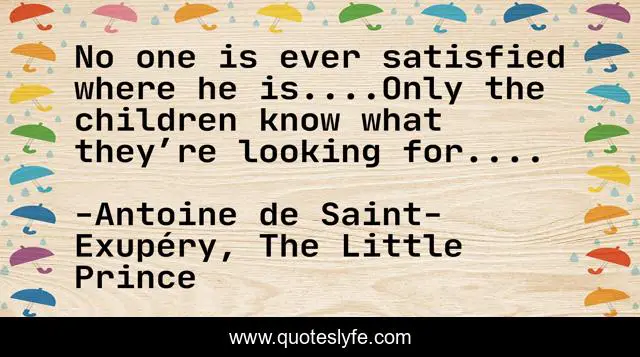 This page presents the quote "No one is ever satisfied where he is....Only the children know what they’re looking for....". Author of this quote is Antoine de Saint-Exupéry, The Little Prince. This quote is about the-little-prince, children, satisfied, searching, satisfaction, antoine-de-saint-exupery, only-the-children,.