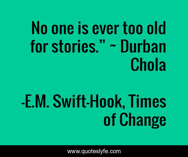 This page presents the quote "No one is ever too old for stories.” ~ Durban Chola". Author of this quote is E.M. Swift-Hook, Times of Change. This quote is about wisdom-in-fiction, wise-words, wisdom, inspirational, enthusiasm,.