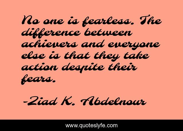 This page presents the quote "No one is fearless. The difference between achievers and everyone else is that they take action despite their fears.". Author of this quote is Ziad K. Abdelnour. This quote is about achievers, fearless,.