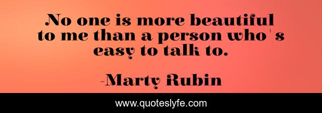 This page presents the quote "No one is more beautiful to me than a person who's easy to talk to.". Author of this quote is Marty Rubin. This quote is about conversation, ease, beauty, talking,.