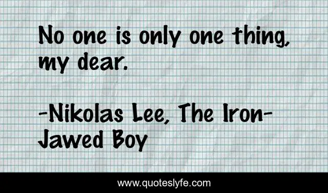 This page presents the quote "No one is only one thing, my dear.". Author of this quote is Nikolas Lee, The Iron-Jawed Boy. This quote is about young-adult, middle-grade, young-adult-fiction, young-adult-series, middle-grade-fantasy, young-adult-fantasy,.