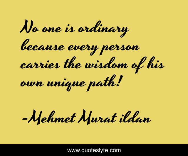 This page presents the quote "No one is ordinary because every person carries the wisdom of his own unique path!". Author of this quote is Mehmet Murat ildan. This quote is about path-of-life, paths, unique, turkish-aphorisms, mehmet-murat-ildan, ildan-wise-sayings, turkish, ildan-wisdom, turkish-sayings,.
