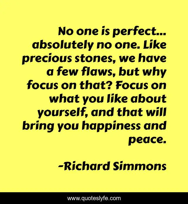 This page presents the quote "No one is perfect... absolutely no one. Like precious stones, we have a few flaws, but why focus on that? Focus on what you like about yourself, and that will bring you happiness and peace.". Author of this quote is Richard Simmons. This quote is about peace, focus, yourself,.
