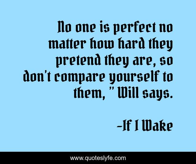 This page presents the quote "No one is perfect no matter how hard they pretend they are, so don’t compare yourself to them, ” Will says.". Author of this quote is If I Wake. This quote is about comparison, pretend, perfection,.