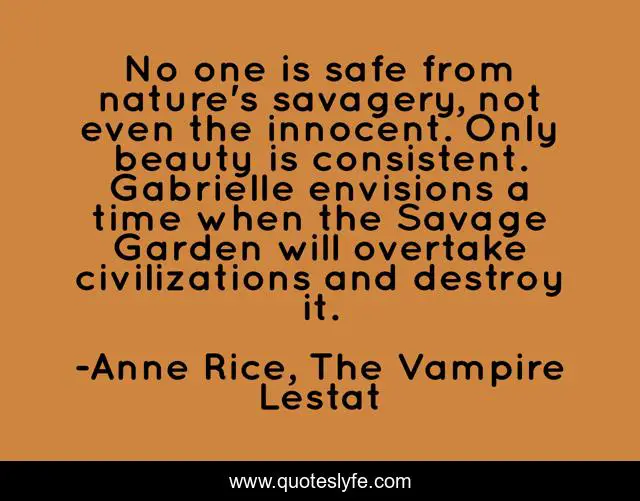 This page presents the quote "No one is safe from nature's savagery, not even the innocent. Only beauty is consistent. Gabrielle envisions a time when the Savage Garden will overtake civilizations and destroy it.". Author of this quote is Anne Rice, The Vampire Lestat. This quote is about civilization, anarchy, savage-garden,.