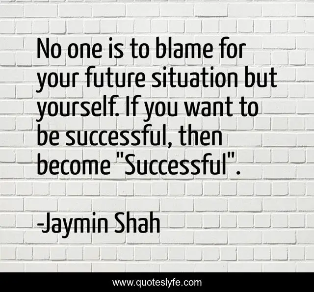 This page presents the quote "No one is to blame for your future situation but yourself. If you want to be successful, then become "Successful".". Author of this quote is Jaymin Shah. This quote is about confidence, inspirational, success, life, experience, failure, life-lessons, enthusiasm, secret-of-success,.