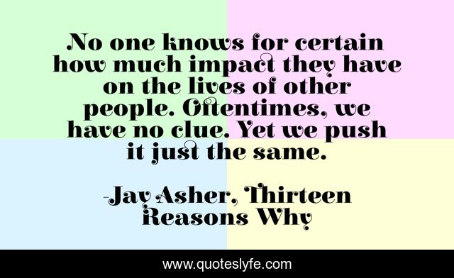 This page presents the quote "No one knows for certain how much impact they have on the lives of other people. Oftentimes, we have no clue. Yet we push it just the same.". Author of this quote is Jay Asher, Thirteen Reasons Why. This quote is about impact, life, reach-out, think, care,.