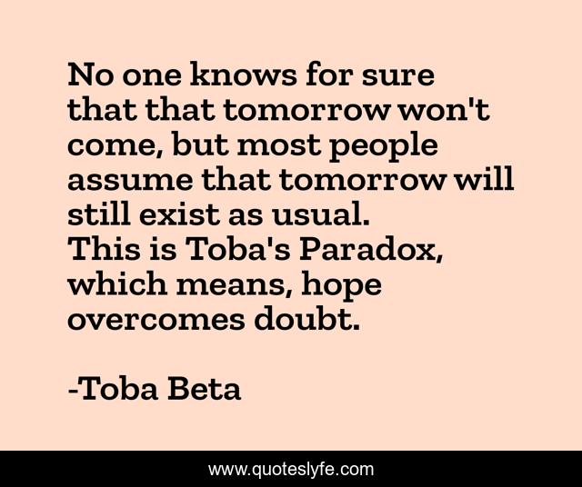 This page presents the quote "No one knows for sure that that tomorrow won't come, but most people assume that tomorrow will still exist as usual. This is Toba's Paradox, which means, hope overcomes doubt.". Author of this quote is Toba Beta. This quote is about life, paradox, doubt, toba, overcome, truth, hope,.