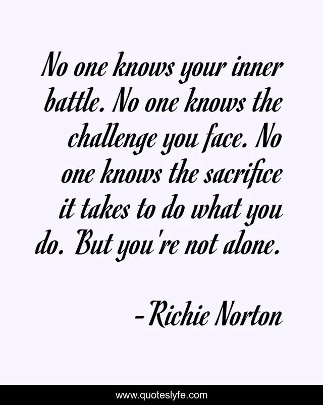 This page presents the quote "No one knows your inner battle. No one knows the challenge you face. No one knows the sacrifice it takes to do what you do. But you're not alone.". Author of this quote is Richie Norton. This quote is about confidence, self-mastery, mindful, marketing, work, success, self-help, entrepreneur, innovation,.
