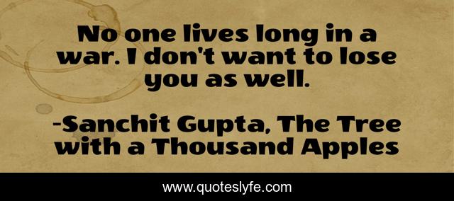 This page presents the quote "No one lives long in a war. I don't want to lose you as well.". Author of this quote is Sanchit Gupta, The Tree with a Thousand Apples. This quote is about drama, fiction, literature, historical-fiction, war,.