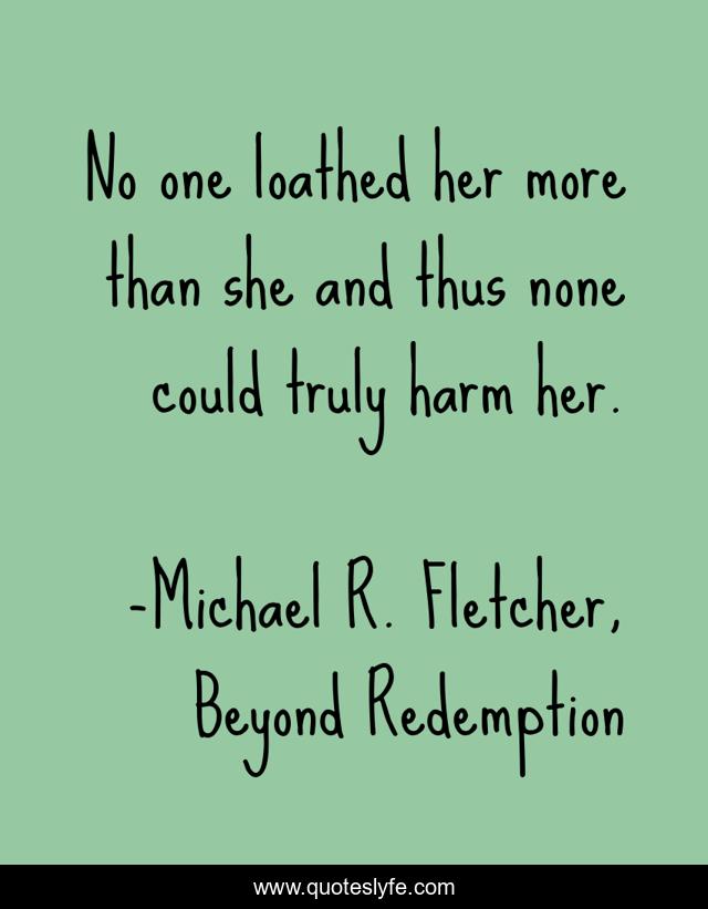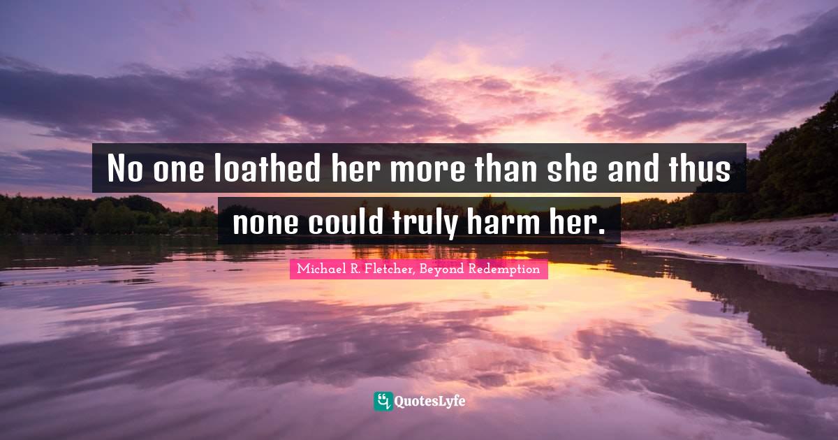 This page presents the quote "No one loathed her more than she and thus none could truly harm her.". Author of this quote is Michael R. Fletcher, Beyond Redemption. This quote is about loath, harm, hurt,.