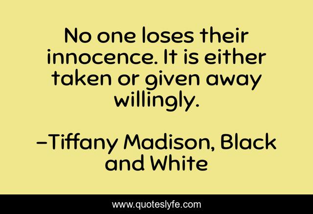 This page presents the quote "No one loses their innocence. It is either taken or given away willingly.". Author of this quote is Tiffany Madison, Black and White. This quote is about choices-and-consequences, innocence,.