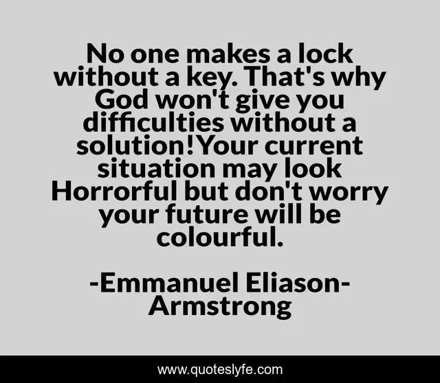This page presents the quote "No one makes a lock without a key. That's why God won't give you difficulties without a solution!Your current situation may look Horrorful but don't worry your future will be colourful.". Author of this quote is Emmanuel Eliason-Armstrong. This quote is about spiritual-growth, confidence, positive, motivational, optimistic, inspirational, enthusiasm,.