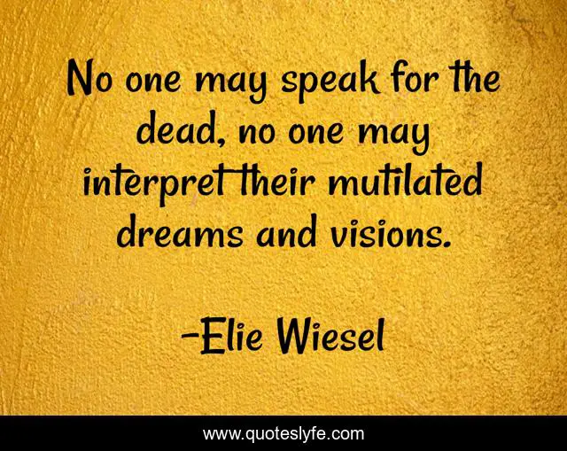 This page presents the quote "No one may speak for the dead, no one may interpret their mutilated dreams and visions.". Author of this quote is Elie Wiesel. This quote is about may, dead, speak,.