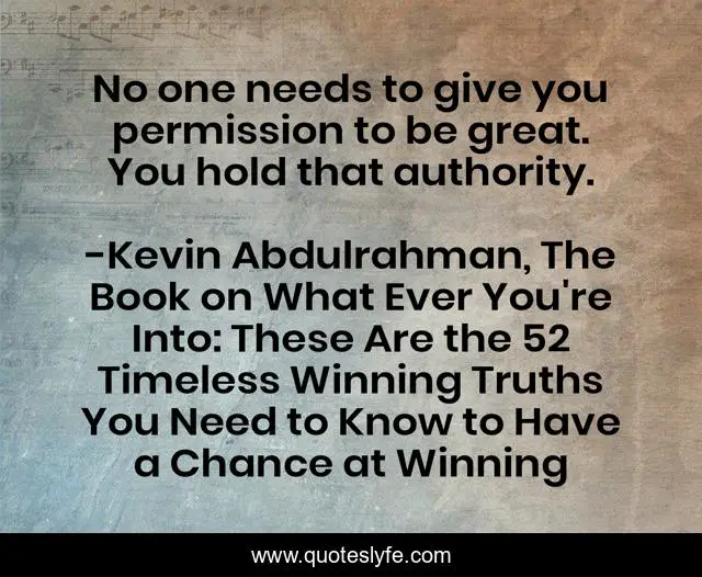 This page presents the quote "No one needs to give you permission to be great. You hold that authority.". Author of this quote is Kevin Abdulrahman, The Book on What Ever You're Into: These Are the 52 Timeless Winning Truths You Need to Know to Have a Chance at Winning. This quote is about motivation, positive, motivational, confidence, optimistic, inspirational, enthusiasm,.