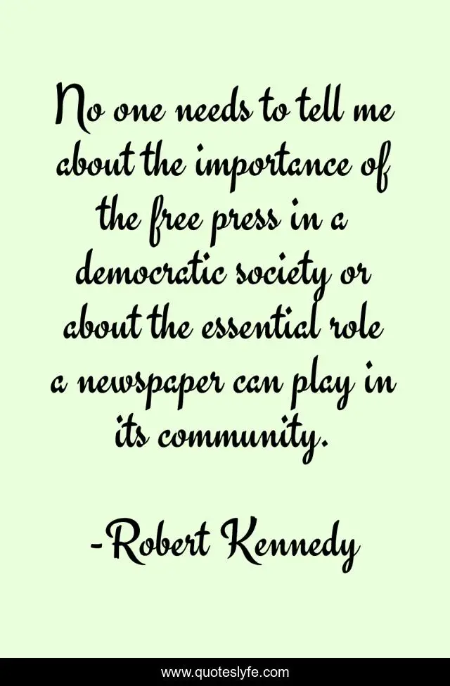 This page presents the quote "No one needs to tell me about the importance of the free press in a democratic society or about the essential role a newspaper can play in its community.". Author of this quote is Robert Kennedy. This quote is about me, community, free,.