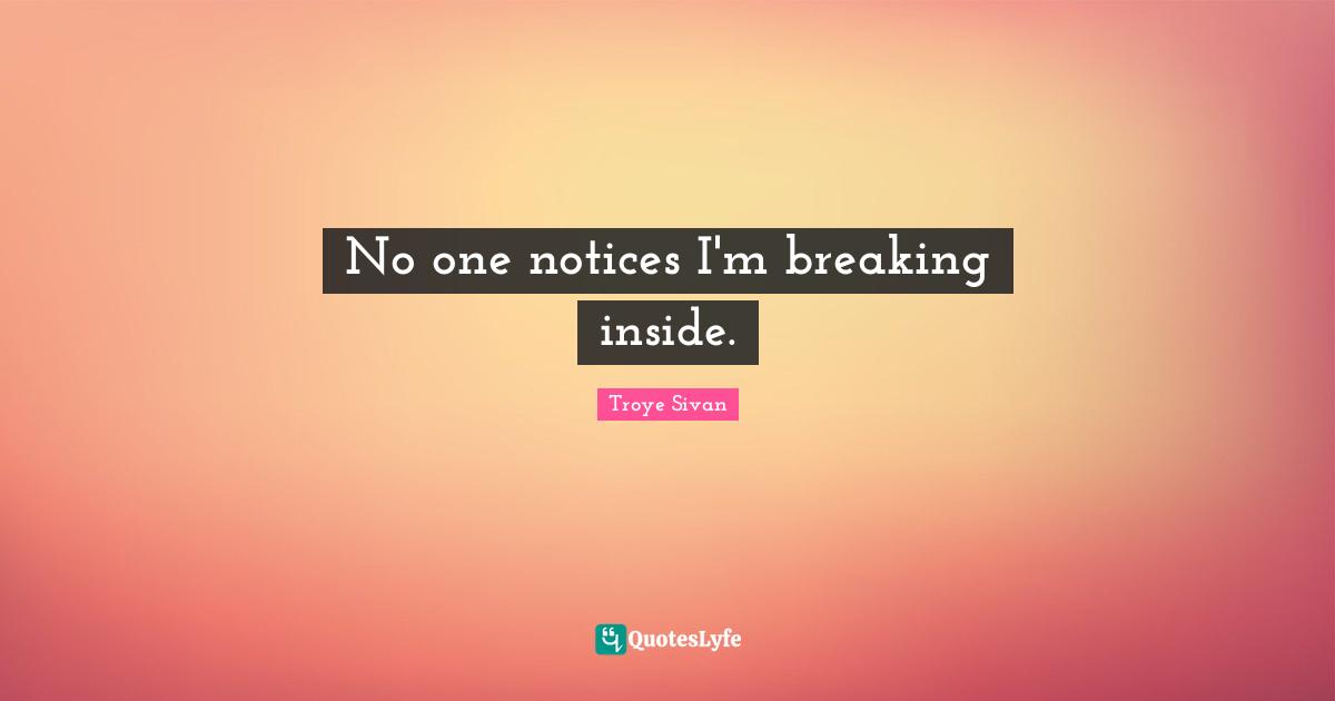This page presents the quote "No one notices I'm breaking inside.". Author of this quote is Troye Sivan. .